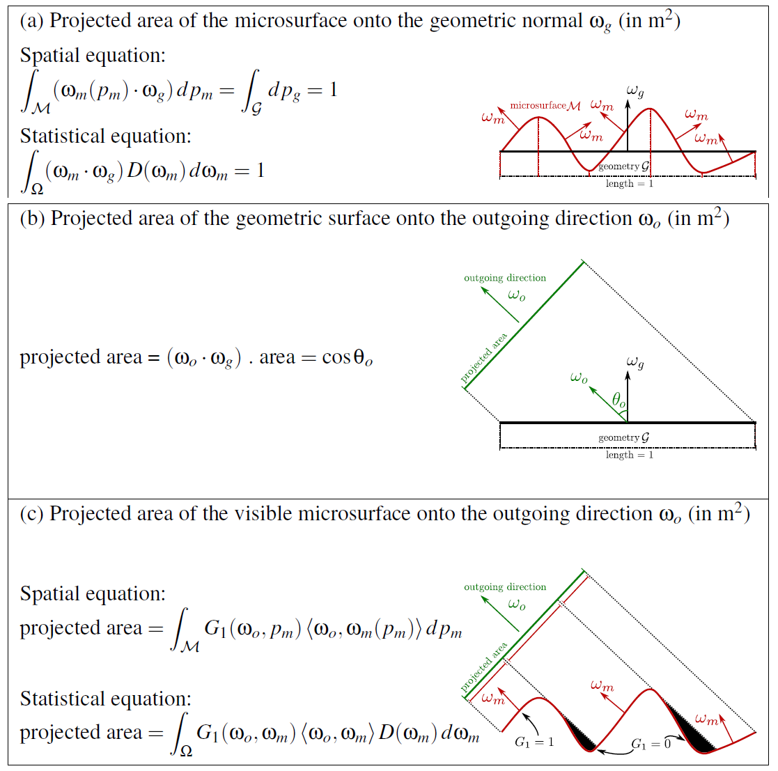 \[p(\omega) = \frac{D(\omega)}{\int_{\Omega} D(\omega) \mathrm{d} \omega},\]where the denominator is the total area of microsurface.