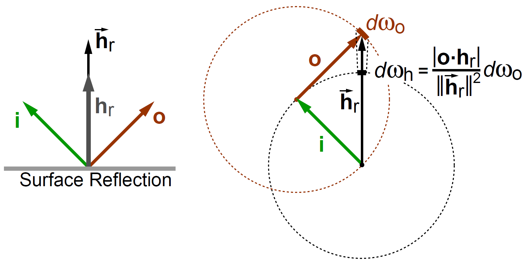 \[|\frac{\mathrm{d}\omega_h}{\mathrm{d}\omega_o}| = \frac{|\omega_o \cdot \omega_h|}{||\vec{h}||^2} = \frac{|\omega_o \cdot \omega_h|}{(\omega_h\cdot\vec{h})^2} = \frac{|\omega_o \cdot \omega_h|}{(\omega_h\cdot(\omega_i+\omega_o))^2}=\frac{|\omega_o \cdot \omega_h|}{(2\omega_h\cdot\omega_o)^2} = \frac{1}{4|\omega_h\cdot\omega_o|}.\]Thus, we have: