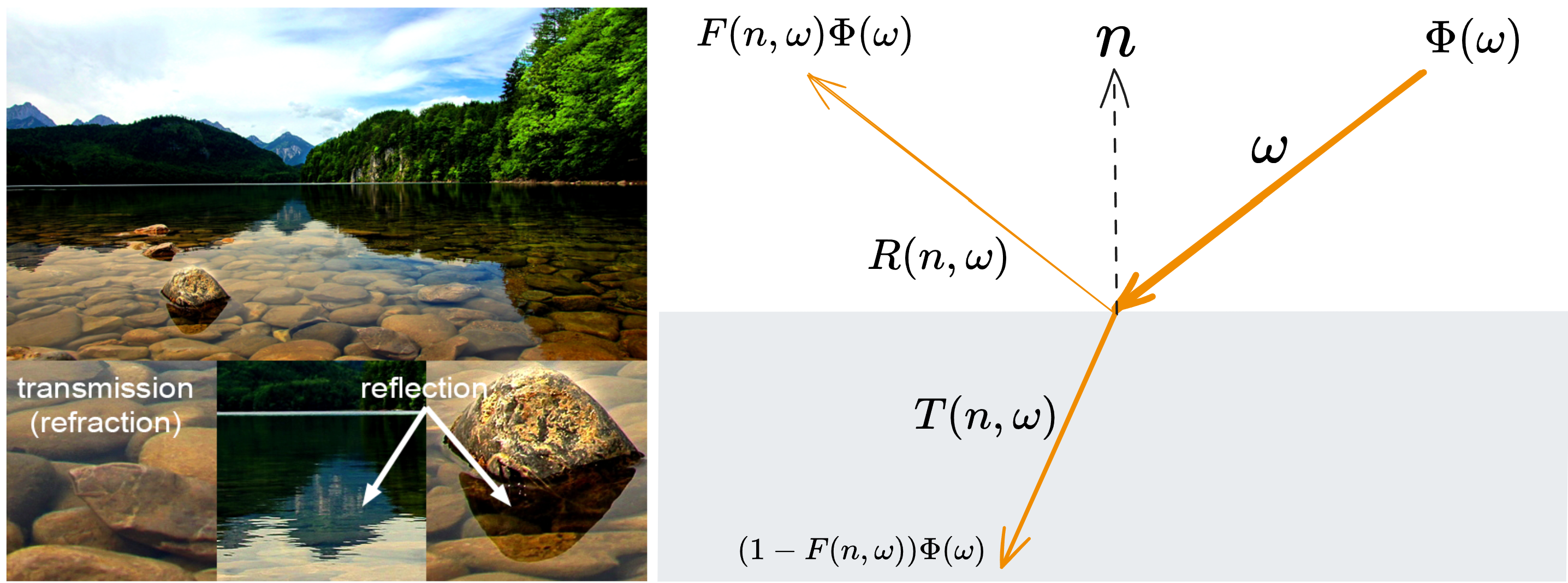 So what does the pure specular BRDF look like? This is what we need to solve in this subsection. To begin with, we need to first get familiar with the fresnel effect. The left image below is borrowed from Reflection, Refraction and Fresnel.