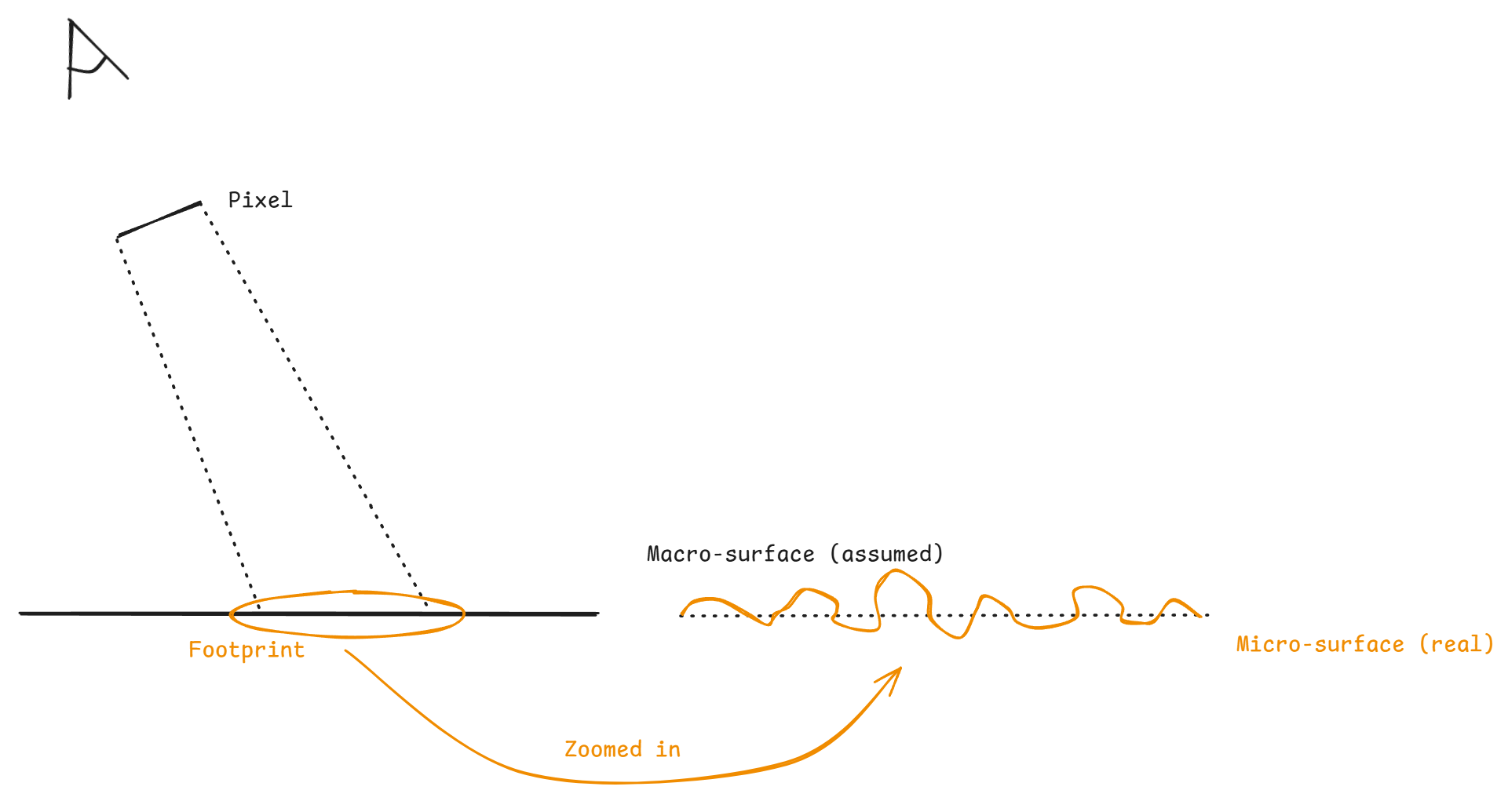 We called the area of the object surface that covered by one pixel the footprint. As illustrated in the figure, there are many complex microstructures within that footprint, we call them microsurface. Due to these microstructures, the appearance of this area should be highly spatial-varying. However, since one pixel can only return one RGB, we need to summarize the appearance of these microstructures with only one RGB value. Obviously, we need to derive the statistical (or aggregated) properities of the microsurface from its spatial properities. Once we have its statistical properites, we can assume that the area within the footprint is flat, which can use only one normal vector to describe it. called geometric surface or macrosurface. This assumed macrosurface needs a complex microfacet theory that summarizes the appearance into one value from its statistical properties. That’s why we need the microfacet model.