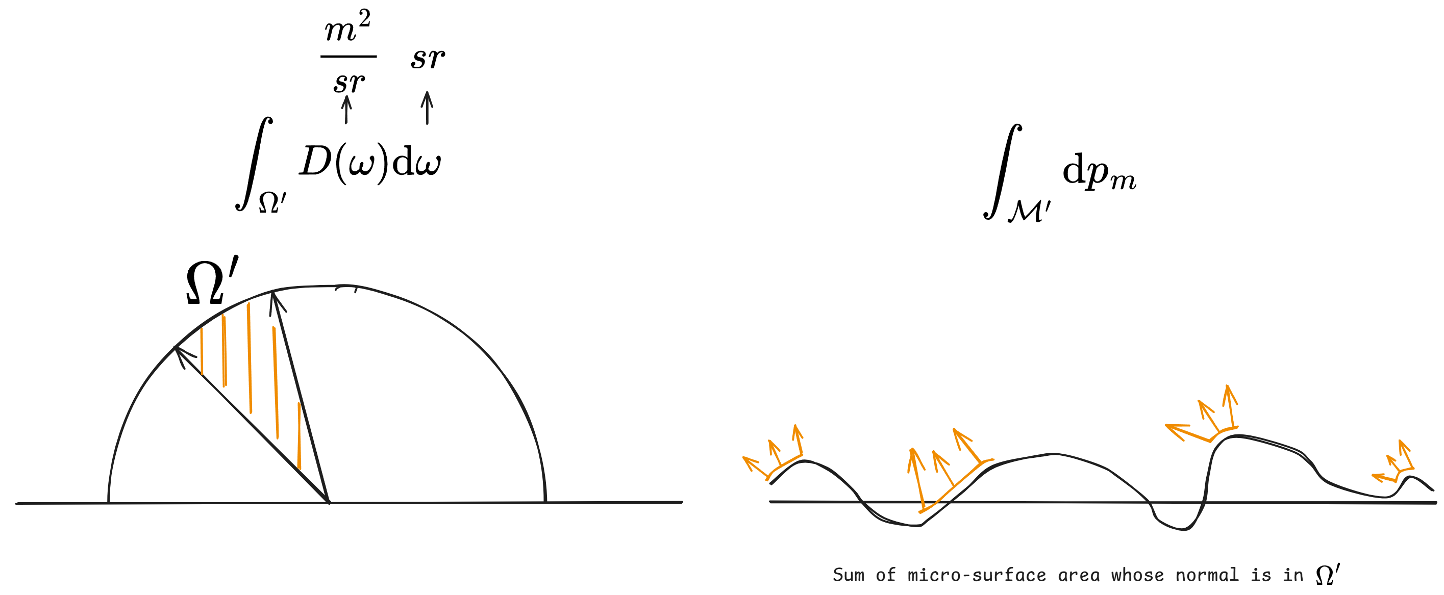 It describes the total area of the microsurface that their normal pointing at direction $\omega$. Thus, the unit of $D(\omega)$ is $\frac{m^2}{sr}$. Why we need to define the NDF? The reason is that, NDF is a bridge to connect two different spaces: one is the spatial space, that is, the microsurface space $\mathcal{M}$, and another is the statistical space, that is, the spherical space $\Omega$. An informal understanding from the relationship of unit is that, $D(\omega)\mathrm{d}\omega$ ($\frac{m^2}{sr} \cdot sr$) indicates all the differential area $\mathrm{d}p_m$ ($m^2$) whose normal pointing toward $\omega$. A more precise description of this relationship is that, given a subset $\Omega^{\prime}$ from the $\Omega$, we can have a corresponding subset $\mathcal{M}^{\prime}$ from $\mathcal{M}$ that $\mathcal{M}^{\prime}$ contains all the points on the microsurface whose normal inside the $\Omega^{\prime}$, and we have: