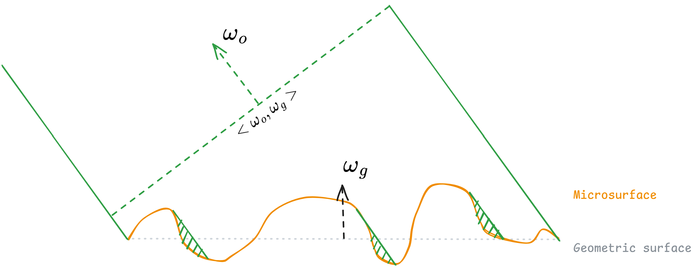 \[A_{proj}(\omega_o) = \int_{\mathcal{M}} W_m(p_m, \omega_o)\mathrm{d}p_m\]Due to the intrinsic of the microfacet assumption, the view-dependent projected area is always $<\omega_g, \omega_o>$, leading to: